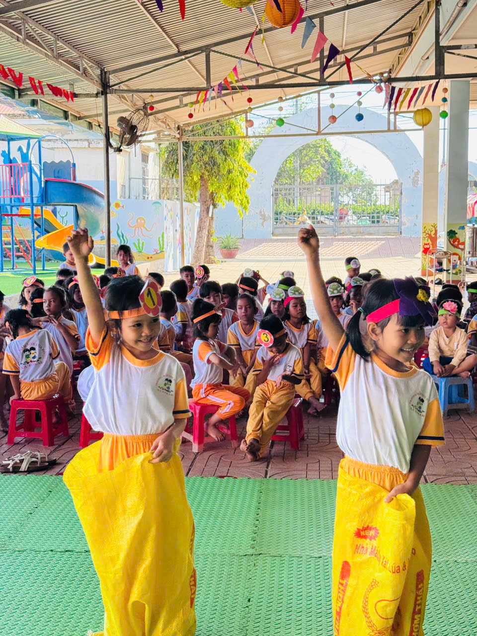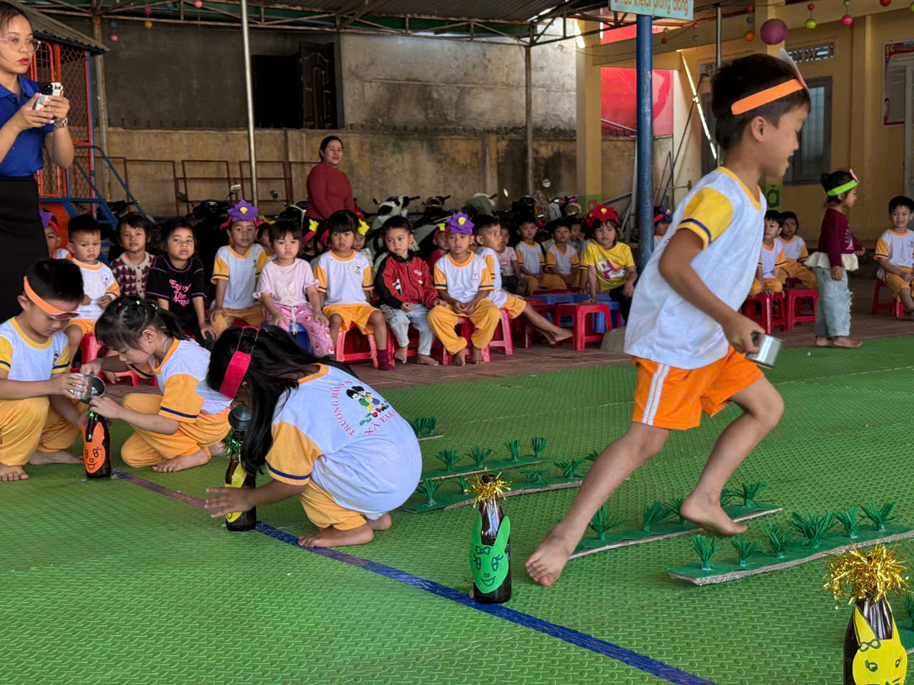 Trò chơi vận động “Nhảy bao bố, kéo ko, kẹp bóng, đổ nước vào chai”